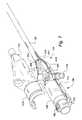 FIGS. 15A-B are perspective views illustrating aspects of a self-contained, low-cost medical instrument for endoscopically guided localized drug delivery, according to some embodiments.FIG. 15A shows aneedle1520 which is to be inserted into the operative channel ofcannula120 viainsertion point116. Note that the piercingtip1522 has an edge (portion1710 shown inFIG. 17, infra) that is beveled upwards so as to prevent thetip1522 catching on any of the inner surfaces ofdevice1400. Two matchingalignment marks1530 and1532 are provided on the sliding alignment lock (SAL)1510 andfluid hub104 respectively, so as to aid in proper orientation of theneedle1520 with respect to thedevice1400. When properly aligned usingmarks1530 and1532, the SAL has anotch1512 that accepts thealignment tab1410 such that the needle and SAL remain in proper alignment. The SAL is slid along thealignment tab1410 until it rests against theentry point116 as shown inFIG. 15B.