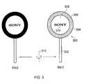 Thedevice300 illustrated inFIG. 3 comprises agrip portion302, which is held in the hand of an audience member, and aplacard304 attached to the end of thegrip portion302. The placard is flat and circular in shape, and comprises a different coloured pattern on each of its sides (shown as side A and side B inFIG. 3). Thedevice300 is rotated about theaxis312 so that either side A or side B is visible at any one time. The coloured pattern on each side comprises a centralcircular region308 in a first colour surrounded by a concentriccircular ring306 in a second colour, the second colour being different to the first. The coloured patterns on each side are different because at least one of the first and second colours on side A is different, respectively, to the first and second colours on side B. For example, as seen inFIG. 3, the colour of the concentriccircular ring306 of side B is different to the colour of the corresponding concentric circular ring of side A. The colour of the centralcircular region308 is the same for side A and side B inFIG. 3. However, it will be appreciated that, in other embodiments, the colour of the central circular region could be different for side A and side B. As will be explained, the differences in the colours used for side A and side B should be chosen such that the different sides of theplacard304 can easily be distinguished in a captured image of the placard. Sponsorship information310 (such as the company logo of a sponsor of the event) may also be included on theplacards304.
