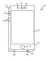 Turning to the drawings and referring initially toFIG. 1, an exampleelectronic device100 is illustrated as a smart phone, such as the iPhone® manufactured by Apple, Inc. It should be appreciated that the smart phone is provided merely as an example and that the methods, techniques and so forth discussed herein may be implemented in a variety of different devices, including desktop computing devices, notebook computers, tablet computers, cellular phones, mobile phones, media recorder/player devices, and the like. Generally, thedevice100 may include aface102 having adisplay104 and one ormore apertures106 to allow for sound waves to traverse theface102 and reach or emit from anaudio transducer107. Additionally, one ormore apertures108 may be provided on at least one side other than theface102 of thedevice100 to allow sound waves to reachaudio transducers109. For example, one or more apertures may be provided in asidewall110 or on a back side of thedevice100 to allow for sound waves to be passed into or out of thedevice100. As discussed in greater detail below, theapertures106,108, may be located at positions on the device and be shaped to help facilitate certain functionality, such as proximity detection.