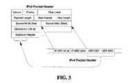 Step408 may include adding other header data from the IPv4 packet to the IPv6 header. One example may be to copy Quality of Service data from the IPv4 header to the IPv6 header. One example of such data may include a Differentiate Services (DS) Field, which may be defined for both IPv4 and IPv6 protocols in IETF publication RFC 2474. The DS field may include a Data Services Code Point (DSCP) field. In various examples, the IPv4 packet may include the DS field in the Type of Service (TOS) location, which may be the second byte of the header (not shown). The entire DS field, or a portion thereof (e.g., the DSCP field), may be copied and included in the IPv6 packet header. In various examples, the copied field may be included in the Priority (i.e., Traffic Class) field in the IPv6 header illustrated inFIG. 3.