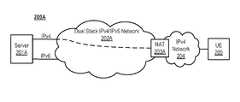 InFIG. 2A, the network backbone may include anetwork202A and one ormore servers201A, which have been upgraded with dual stack legacy/new protocol (e.g., Ipv4/IPv6) equipment, which fully supports both legacy and new Internet protocols (e.g., IPv4 and IPv6) simultaneously. “Dual stack” refers to the fact that such networks and devices implement two complete communication protocol stacks for legacy and new Internet protocols simultaneously (e.g., IPv4 and IPv6 respectively). The dual stack network and servers may permit the expansion of services to new user equipment and upgrading of current equipment, taking advantage of the larger address space of IPv6 or other new Internet protocol. In some examples, while IPv6 continues to be deployed, legacy (e.g., IPv4) protocol and network address translation (NAT) may remain to serve legacy IPv4 local networks and equipment (e.g.,network204 and one or more UE205). NAT may for example be performed bygateway203A, which connectsnetwork202A withnetwork204.