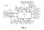 FIG. 9 is an example block diagram ofequipment900 in which the various disclosed embodiments may be implemented. Amain processor901 is configured to perform various Link, Internet, Transport, Application, or other communication stack-layer operations, and to control operation of other components ofequipment900.Processor901 may be implemented with any of numerous types of devices, including but not limited to one or more general-purpose microprocessors, one or more application specific integrated circuits, one or more field programmable gate arrays, and combinations thereof. In at least some illustrative embodiments,processor901 carries out operations described herein according to machine readable instructions (e.g. software, firmware, etc.) stored inmemory902 and903 and/or stored as hardwired logic gates withinprocessor901.Processor901 communicates with and controlsmemory902 and903 and other components withinequipment900 over one or more buses.