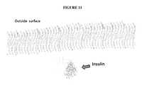 FIG. 13 shows a close in illustration of insulin in a basic cholestosome matrix, in this case formed from cholesterol esters of myristate and laurate. Sizes include: the membrane shown as matrix is 36 nm long and 4 nm wide Insulin is 4 nm at the widest spot. The diameter of the cholestosome vesicle shown is 100 nm for illustration purposes.