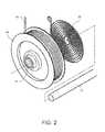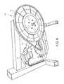 As best shown inFIG. 2, the exemplary one-way cable spool24 comprises an integrally (or separately) formed one-way needle bearing31 which locks to thesteel axle22 upon rotation of thecable spool24 in a working force-resistance direction, and which releases from theaxle22 upon counter-rotation of thecable spool24 in an opposite cable-wind-up direction. Theflexible cable14 is attached to the force resistance assembly12 (e.g., at cable spool24), and is adapted for winding on and unwinding from thecable spool24 during use of theexercise device10, as discussed below. Theexemplary cable spool24 may have circumferential surface grooves which serve to substantially limit overlap of thecable14 when winding on thespool24. Aspiral torsion spring32 or other biasing means is attached at one end to the mountingframe21 and at its other end to thecable spool24, and functions to normally urge counter-rotation of thecable spool24 in the cable-wind-up direction.