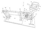 Referring toFIGS. 1 and 3, theexemplary exercise bar15 is slidably secured to theflexible cable14, such that theexercise bar15 can be manually lifted relative to the standingplatform11 with substantially smooth uniform resistance as thecable14 lengthens from thespool24. In the present embodiment, theexercise bar15 comprises an elongated rigidhollow member35 with respective cable pulleys36,37 (or bearings) located at opposite open ends. The cable pulleys36,37 are attached viabrackets38,39. A loopedfree end14A of theflexible cable14 is passed into a first open end of theexercise bar15 overcable pulley36, extends throughhollow member35, and outwardly through the second open end overcable pulley37 towards the standingplatform11. The cablefree end14A is releasably anchored to a fixedplatform bracket41 using ametal carabiner42 or other suitable fastener. In a ready position shown inFIG. 1, theexercise bar15 sits on an adjustablyelevated bar rack44A,44B in a substantially zero resistance condition—tensioned only by the wind-up force of thetorsion spring32. Anultra-slim weigh pad45 may be integrally formed with or adjacent the standingplatform11, and may operatively connect (e.g., wirelessly or via cable) to theelectronic operator console18 to communicate a measured real time force exerted by the user when performing an exercise.