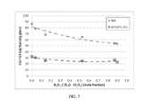 FIG. 6 graphically depicts diffusivity D (y-axis) as a function of the ratio (B2O3/(R2O—Al2O3)) (x-axis) for inventive and comparative glass compositions; and