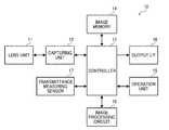 FIG. 1 illustrates an example of the configuration of an imaging device according to an embodiment of the present invention. The imaging device may be any of a digital camera, a camcorder, a pair of digital binoculars, a laptop personal computer (PC), a tablet PC, a smartphone, a mobile phone, a personal digital assistant (PDA), or the like. Note that the camcorder includes, for example, a vehicle-installed camera and a surveillance camera. Animaging device10 includes alens unit11, a capturingunit12, acontroller13, animage memory14, anoperation unit15, an output interface (I/F)16, atransmittance measuring sensor17, and animage processing circuit18.