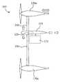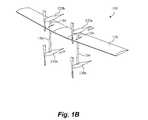 FIGS. 1A-B are side and perspective top view illustrations of amulti-rotor aircraft105 according to an exemplary embodiment described herein. Anairfoil110 is presented with a first set ofthrust producing engines120a,120bpositioned over a given side (shown here as “above”) of theairfoil110, and a second set ofthrust producing engines130b,130bpositioned over the other side (shown here as “below”) of theairfoil110. Airfoil110 is a wing with no significant flight control surfaces. That is, no elevator (for pitch) or rudder (for yaw) is used inairfoil110.