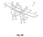FIGS. 2A-B are side and perspective top view illustrations of amulti-rotor aircraft205 according to an exemplary embodiment described herein, withairfoil210 andengines220a,bor230a,bshifted. Theairfoil210 containsstrut apertures208 adapted to accommodate vertical translation and horizontal translation of theairfoil210 in reference to engine struts250.Airfoil210 can be elevated or lowered along struts230 and fixed at this relocated position, to allow more separation space between theairfoil210 and a givenengine pair220a,bor230a,b. Also,airfoil210 can be shifted forward and aft within theseairfoil apertures208. The added separation space can allow forpayload225 that would not normally fit in a mid-airfoil configuration. Thus, instead of requiring a larger quadrarotor aircraft for delivery of larger payloads, theexemplary aircraft205 can be modified to accommodate thelarger payload225. Of course, altering theairfoil210 vertical and/or horizontal position will alter the flight characteristics of theaircraft205. However, it is understood that the unbalancing effects can be compensated by appropriate thrust control of the engines and/or repositioning of the engines, as described below.