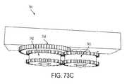 FIGS. 73A-73C show several views of a tube-restoringapparatus741 in accordance with an embodiment of the present disclosure. Theapparatus741 includes adrive gear744 that is coupled to a first restoringgear742. The first restoringgear742 is mechanically coupled to a second restoringgear743. A tube may be placed between the first and second restoringgears742,743. Portions of the first and second restoringgears742,743 define aspace745 in which a tube may be positioned. Rotation of the first and second restoringgears742,743 closes the distance between thespace745 when the tube is positioned between the first and second restoringgears742,743. The transition from a non-restoring position to a restoring position is shown inFIG. 73B toFIG. 73C. For example, a tube may be positioned such that an occluder presses against the tube from the bottom up (as shown inFIG. 73B). If the tube becomes distorted over time, a motor connected to thedriving gear744 rotates thegears743 and744, to press against the walls of the tube (as shown inFIG. 73C) to restore the tube such that a cross-section of the tube has a general circular shape by compressing on the wall portions of the tube that are expanded beyond a center axis of the tube such that the tube is distorted into an oval shape, for example.