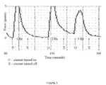 FIG. 3 illustrates uterine muscle activity over time when a stimulation current is applied. As shown inFIG. 3, uterine muscle action returns to baseline immediately after the current is switched off when using frequencies up to about 5 Hz. In some instances, the maximal contractile activity begins to fall well before the current is turned off, which is indicative of stimulated phasic contractile activity. The stimulated phasic contractile activity shown inFIG. 3 can be considered short stimulated phasic contractions, as the stimulation duration is substantially small (e.g., less than about 3 minutes) and the stimulation frequency lies within the conventional uterine stimulation frequency range. In some embodiments, short stimulated phasic contractions can be specified as having a minimal duration time of about 30 seconds and a maximum duration time of about 3 minutes. Uterine muscle stimulation within these established ranges and the resulting phasic contractile activity are not thought to be useful for stopping uterine blood loss in the case of uterine rupture and postpartum hemorrhage.