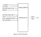 FIG. 4 shows acontroller12 block with some vehicle inputs and power source input parameters shown. The vehicle inputs are indicative of the current operating state of the vehicle such as vehicle speed, accelerator pedal position, brake pedal position, transmission gear (if applicable). The power source parameters includebattery pack3 voltage and state of charge,capacitor bank1 voltage and state of charge (for diagnostic comparison), andmotor5 speed.