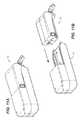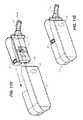 FIGS. 11A-E provide a schematic depiction of an exemplary dispensing device wherein the device is designed to deliver drug dosage forms to oral mucosa of a patient under treatment.FIGS. 11A-E illustrate the progression of Intact drug dispensing device11 (FIG. 11A); thereusable head13 anddisposable body15 of a drug dispensing device (FIG. 11B); areusable head13,disposable body15 andcartridge17, a dispensebutton23, and aproboscis31 of a drug dispensing device (FIG. 11C); various aspects of adrug dispensing device11 including areusable head13,disposable body15 andcartridge17, aproboscis31, and alatch19 to unlock the device, ahub lock21, adistal seal33,35, and a power train coupling25 (FIG. 11D); and a reassembled intact drug dispensing device11 (FIG. 11E).