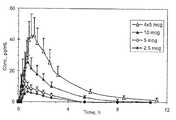 BRIEF DESCRIPTION OF THE DRAWINGSFIG. 1 is a graphic depiction of sufentanil plasma concentration mean+/−standard deviation (SD) versus time, following sublingual administration of 2.5, 5, 10 and 20 mcg (5 mcg every 10 minutes×4 doses) sufentanil dosage forms (slow-eroding) in healthy human volunteers.