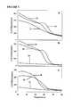 Certain of the Figures are illustrative of techniques that take advantage of the foregoing possibilities.FIG. 4 shows the melting behavior of two mismatch-tolerant probes against the 16s ribosomal RNA gene of several species of Mycobacteria. Two probes were used: the hairpin-forming, quenched probe described in Example 2, having thesequence 5′-Cy5-CTG GAT AGG ACC ACG AGG CCA G-BHQ II-3′ (SEQ. ID No. 2) and a TAMRA-labeled probe having thesequence 5′-G CAT GTC TTG TGG TGG-TAMRA-3′ (SEQ. ID No. 3). It was found that the latter probe, which was unquenched, gave discernable signals above background for several species. Panel A ofFIG. 4 presents melting curves for the hairpin probe with no target (line41),M. asiaticum(line42),M. gordonae(line43),M. heidelburgense(line44),M. malmoense(line45) andM. marinum(line46). Panel B presents melting curves for the TAMRA-labeled probe with no target (line47),M. asiaticum(line48),M. gordonae(line49),M. heidelburgense(line50)M. malmoense(line51), andM. marinum(line52). Panel C ofFIG. 4 plots the ratio of TAMRA fluorescence toCy 5 fluorescence),M. asiaticum(line53),M. gordonae(line54),M. heidelburgense(line55),M. malmoense(line56) andM. marinum(line57).