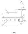 FIG. 11 is a sketch map of the method for printing on elevation contours of the print object in another embodiment. The positioning and printing apparatus for the uneven Z height surface elevation surface in this embodiment includes aprinting carriage1, a supportingbeam2, aprinting platen3 for the print object and thecontrol system4. Theprinting carriage1 can move horizontally forward (left) and backward (right) along the supportingbeam2 according with the X axis, and the supportingbeam2 can move forward and backward along the Y axis which is perpendicular with the supportingbeam2 according with the object motion direction.Printing object7 with multi-row uneven Z height surface elevation features71 is placed on theprinting platen3 and the uneven Z height surface elevation features can be the same or different. The maximum width of the features in each row is smaller than the scanning width of the laser Zheight scan sensor11, while the height or depth of the uneven Z height surface elevation features71 is the same. The laser Zheight scan sensor11 detects the uneven Z height surface elevation features71 in the first row by one scan pass, and then the software program calculates the position coordinates of the uneven Z height surface elevation features71 to form a combined imaged. Then thecontrol system4 controls the print heads12 to print the image on the surface of the elevation contours in the first row by one-pass or multi-pass printing horizontally forward (left) and backward (right) along the X axis or Y axis. After printing the first row, theprinting carriage1 goes back to its home station and the supportingbeam2 moves to the next row of the elevation contours along the Y axis. After that, the laser Zheight scan sensor11 detects the elevation contours in the second row by one scan pass, and then the software program calculates the coordinate of the elevation contours to form another combined image. Then thecontrol system4 controls the print heads12 to print the image on the surface of the elevation contours in the second row by one-pass or multi-pass printing along the X axis or Y axis. The printer repeats the above procedure until all rows of elevation contours are printed with image.
