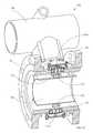 An advantage of arranging the mountingflexures1502 through1509 tangentially as shown, is that the natural modes of vibration can be less influenced by the stiffness of the mounting flexures, and the stress in the mountingflexures1502 through1509 can be configured to have lower values because they can be made to be any length regardless of the width of the annular space between thesensor element1501 and the outer conduit in which it may be mounted (not shown).Magnets1510 through1513 (magnets1512 and1513 not visible in this view) are hydro-dynamically shaped to prevent abrasive wear.