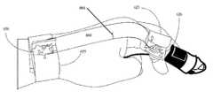 FIG. 4E is a perspective view illustrating a loop formed by a signal cable circling around a first identification band affixed at the finger, and a loop formed by the signal cable circling around a second identification band affixed at the wrist.