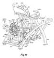 FIG. 2 is a front perspective view of one specific embodiment of anapparatus10 as shown inFIG. 1 illustrating the elements described above from a different angle and showing in addition a manually engageable and actuatable screwable arc segment selectablemechanism225 that is mechanically interconnected between theframe component17 and the pivotable resistance assembly mounting bracket orarm38. This illustration shows the device from thefront region12 perspective. Once again it can be seen that foot supports24aand24bare suspended from their respective linkages. Drivelinkages28aand28b(not shown inFIG. 2) are coupled at their first ends to the substantial mid-point of front linkages orlegs26aand26b, respectively. Drivelinkages28aand28bare coupled at their second ends to a crankassembly40a,40b,40c,40dcontained withinhousing30, which contains the resistance assembly shown inFIG. 4 and described in greater detail below.