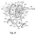 FIG. 13 is a generic left side view of the front ends of theFIGS. 1-12 apparatuses showing in exploded format for purposes of illustration a typical arrangement of rotation increasing pulleys and drive belts that can be interconnected between the primary crank drive shaft and the axle of the fan wheel.