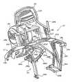 As shown inFIGS. 7, 8 as thefoot pedal assemblies24,26 travel along the arcuate path AP″ from either front to back or from back to front, the handles106 and arms100 follow the front to back movement of the pedals with a pivoting front to back or back to front movement. That is, when theright pedal24amoves forwardly the right handle106aand arm100apivot or move forwardly; when theright pedal24amoves backwardly the right handle106aand arm100apivot or move rearwardly; when the left pedal24bmoves forwardly thehandle106bandarm100bpivot or move forwardly; when the left pedal24bmoves rearwardly thehandle106bandarm100bpivot or move rearwardly. Such following motion is shown for example with reference to fourbar linkage arm26din three sequential front to backpositions26d1, d2 and d3 which correspond respectively to arm100apositions,100a1, a2, a3. The degree of front to back pivoting of the arms100a, bcan be predetermined at least by selective positioning of the pivot joints108a,108b,110a,110b, selective positioning ofcross bar500 and selection of the lengths oflinkage arms102a,102b.