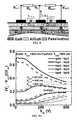 FIG. 12 is a graph comparing drain current and integrated current (charge) during ramping of Vdsfor a device having a drain field cage and a reference device having 3 horizontally spaced field plates. Shown is data for ramping from Vds=0 to Vds=500 V at dV/dt=100 V/ns. The devices included a DFC device with tap pitch=1 μm, dtap=400 nm, and hpass=400 nm (solid lines) and a reference device with three field plates spaced horizontally by 250 nm (dashed lines, where this reference device is the same device as curve labeled “i” inFIG. 3C).