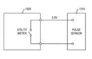 To illustrate the value of a specified transformation function, consider the example of a pulse sensor inFIG. 13. As illustrated,pulse sensor1310 can be coupled toutility meter1320 via a pair of conductors. The actual wired interface betweenpulse sensor1310 andutility meter1320 can vary depending on the type of utility meter that is present. As illustrated,pulse sensor1310 can be configured to provide 3.3V on a first conductor.Utility meter1320 includes a dry contact relay that would successively relay the 3.3V provided bypulse sensor1310 and then open the relay. In one example, a first state of the relay can correspond to a first part of a disk rotation, while a second state of the relay can correspond to a second part of a disk rotation. Where the first state of the relay corresponds to a first half of the disk rotation and the second state of the relay corresponds to a second half of the disk rotation, then a full rotation of the disk would encounter two changes in state of the sensed value atpulse sensor1310. As would be appreciated, utility meters can be defined such that a different number of state changes in the relay can be produced for a single disk rotation. Thus, whilepulse sensor1310 can measure the number of changes in the state of the relay atutility meter1320 over a period of time,pulse sensor1310 would not know how many disk rotations actually occurred atutility meter1320 in that period of time. Without knowledge of the number of disk rotations that actually occurred atutility meter1320, information about the amount of a utility service consumed would not be available.