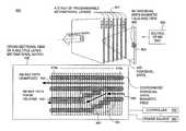 FIG. 3 illustrates aprogrammable layer300 of a 2D metamaterial film. Theprogrammable layer300 of the metamaterial film comprises magnetically active SRRs301 (shown in a darker shade) and magnetically inactive SRRs302 (shown in a lighter shade). By selectively turning on one or more of split-ring resonators, a holographic fringe like magnetic pattern is created. The resulting magnetic fringe pattern can then be used to modify a traversing wave in the magnetic domain much like a holographic fringe pattern can affect optical wavelengths for beam shaping. InFIG. 3, amagnetic fringe pattern303 is created using software via a processor that generates hologram like images for metamaterial SRR arrays. Aside view304 of the programmable layer illustrates aside view305 of the individual SRRs, and aside view306 of the magnetic fringe patterns.