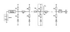 FIG. 9 is a schematic depicting a rearrangement of the example embodiment inFIG. 8 with insets of the input conductance versus power for each rectifier cell;