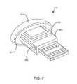 Cap512 further includes anaperture514, which provides access to analytetest strip port515. In operation, an analyte test strip is inserted throughaperture514 and into analytetest strip port515. In one embodiment,aperture514 provides sufficient clearance to accept a wide variety of different analyte test strips form factors. In an alternative embodiment,aperture514 may be customized to receive a specific analyte test strip form factor. Customizing the aperture size or shape to a specific analyte test strip form factor can prevent the use of non-matching or incompatible analyte test strips with analytetest strip port515.Aperture514 may also be formed with a one-way valve or port protector to swipe across the surface of an analyte test strip when the analyte test strip is passed throughaperture514. Such an embodiment may be used to protect analytetest strip port515 from unwanted contaminants. In alternative embodiments,aperture514 may incorporate one or more port protectors, such as disclosed in U.S. Patent Application Publication No. 2009/0270696, which is incorporated by reference herein in its entirety.