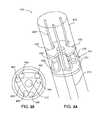 Themedical implant170 is coupled to the coupling device99 when the anchoringelements450 are locked between the upper andlower plates425,430 and the encircled by thetubular channel405. It should be noted that in this embodiment, as the anchoringelements450 are locked between the upper andlower plates425,430, themedical implant170 is coupled to thepivot410 without any direct mechanical connection. For example, when a practitioner loads the medical implant onto theinterventional delivery system100, she withdraws the generallytubular channel405 to expose thegap444 and places thedistal end435 of the anchoringelements450 in thegap444. Optionally, theupper plate425 includesgrooves445 which allow threading the anchoringelements450 therethrough, for example as shown atFIG. 2A. The upper andlower plates430, together with the wall of the generallytubular channel405, holds the anchoringelements450 locked in thegap444. In such a manner, the anchoringelements450 may be released when the generallytubular channel405 is retrieved from being placed in line with thegap444, for example by retrieving the generallytubular channel405 while maintaining thepivot410 in place or pushing thepivot410 while maintaining the generallytubular channel405 in place. During the implantation, the withdrawing of thetubular channel405 may be done by pulling the generallytubular channel405 while holding thepivot410 in position, by manipulating thepivot grip345, thesafety pin160, and/or thedelivery rod handle135, for example as described.
