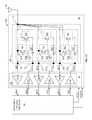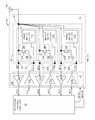 FIG. 33 illustrates another embodiment of a tunable RF filter structure with amplifier stages electrically connected within and between tunable RF filter paths.