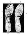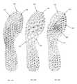 Further examples of variations in customized design based on variations in user preference criteria for a single set of input parameters and performance metrics can be seen inFIGS. 25A to 25E. For example,FIGS. 25A and 25B show two plates (350,355) with identical input parameters and performance metrics but with theplate350 designed to lower weight (by increasingvoid310 distribution and size, especially within themidfoot region360 and theouter edge365 of theforefoot region370 where the magnitude of the performance metric data is lower), whileplate355 is designed with traction being set as a more important parameter than weight reduction (resulting infewer voids310 and more traction elements380).