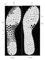 FIGS. 26A and 26B show plates (420,425) designed using the same user selection criteria (e.g., traction element shape, size, distribution, etc) and the same plate structure (withbars415 connectingindividual traction elements430 in web-like or lattice structure) but with input parameters (e.g., pressure and force data and performance metrics e.g., analyzed and processed input data based on a preselected algorithm) from two different athletes. As can be seen, the algorithms used to process the input parameters, even for the same user selection criteria, producedifferent traction element430 distributions due to the different input parameters generated by different athletes. The addition of a web-like structure withbars415 or other elongate elements allows for the incorporation of structural elements designed to provide controlled stability, flexibility/stiffness, support, and/or protection depending on the shape, thickness, and orientation of the elongate elements.