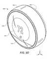 FIGS. 9A-9D illustrate front, bottom, side, and perspective views, respectively, of an intelligent thermostat, according to some embodiments.