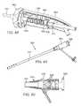Thehousing332 is configured to actuate the deflection (articulation) mechanism inside the handle when it is squeezed by the hand of a user. For example, thehousing332 can comprise alower housing section368 and anupper housing section370, which can be comprised of twoseparable housing sections370a,370bfor ease of assembly. Referring toFIG. 36, thelower housing section368 is mounted to theupper housing section370 in a manner that permits the two sections to move toward and apart from each other a limited distance when squeezed by a user's hand, as indicated byarrow374. Thetorsion spring338 has onearm376athat bears against the inner surface of theupper housing portion370 and anotherarm376bthat bears against the inner surface of thelower housing portion368 to resiliently urge the two housing portions apart from each other. As such, squeezing the handle moves the upper and lower housing portions together and releasing manual pressure allows the housing portions to move apart from each other a limited amount under the spring force. In an alternative embodiment, a portion of the housing can be made of a flexible or deformable material that can deform when squeezed by the hand of a user in order to actuate the deflection mechanism.