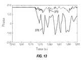 FIG. 12 is a graph including acurve373 that depicts the power of the second order harmonic, with respect to time, determined utilizing the pressure fluctuation information that was collected from thepressure sensor306 of thedefective pump202 and utilized to generate thecurve371 ofFIG. 11.FIG. 12 also includes acurve374 that depicts the power of the second order harmonic determined utilizing the pressure fluctuation information that was collected from thepressure sensor306 of thehealthy pump202 and utilized to generate thecurve372 ofFIG. 11. As withFIG. 11, thecurves373 and374 ofFIG. 12 depict the powers of the second order harmonic of bothpumps202 as being substantially negligible until about the time of 1272 seconds. At that time, one of thepumps202 has become defective, such that thecurves373 and374 each depict an appreciable increase in power. However, it is clear that thepump202 to which thecurve373 corresponds is the defective pump, because the power increase exhibited by thecurve373 is substantially greater than the power increase exhibited by thecurve374. For example, the maximum peak of thecurve373, at about 1285 seconds, is about three times as great as the maximum peak of thecurve374 at the same time.