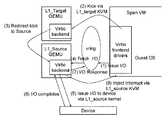The first problem relates to the fact that, since a Span VM runs on two L1 hypervisors, it is associated with two QEMU processes, one on L1 source and another on L1 target′ as shown inFIG. 5. Thus a single virtio frontend with one vring is now associated with two virtio backends. If both virtio backends access the vring concurrently, race conditions would result in corruption of the vring buffers. To solve this problem, only one virtio backend is allowed to pick up I/O requests and deliver I/O responses through the vring. So, for example, assume that the virtio backend at the L1 source is configured to interact with the vring. If an L2 VCPU running at L1 source issues an I/O request, then the corresponding kick will be handled by L1 source QEMU. However, if an L2 VCPU running at the L1 target issues an I/O request, then the corresponding kick will be redirected to the QEMU at L1 target. The backend in L1 target QEMU will not access the vring to fetch the I/O request. Instead, the QEMU backend at L1 target is modified so that it redirects the kick one more time to the QEMU at L1 source. At this point, the QEMU backend at the L1 source fetches the I/O request from the vring and processes the request via asynchronous I/O. Once the I/O completes, the L1 source QEMU injects an I/O completion interrupt into the guest to notify the frontend.