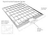 FIG. 34 is an exploded view of the embodiment shown inFIG. 33, showing the stack up of the substrate, with the drive lines atop that, and the chip with the processing electronics mounted to routing lines which feed the drive plates, as well as feed lines with connect to the sense lines on the upper layers and host interconnect. A dielectric layer separated the drive and pickup lines. The dielectric has cutouts to allow the interconnect pads to feed the pickup signals back to the processing electronics. A thin protective layer, typically of a polymer film or very thin glass is mounted on top of the sense plates.