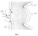 Another benefit of thefrustoconical electrodes120 compared to the conventional annular electrodes is with respect to back streaming electrons. More particularly, there is a finite probability that some of the electrons striking thetarget102 could turn back and stream back to theaccelerator section109. These electrons have a relatively wide energy distribution from full energy to several eV's. Conventional annular (or straight) accelerator electrodes may not adequately shield the insulator surfaces, resulting in a chance that these back streaming electrons will strike the surfaces of the insulator and create a charging up effect, which in turn could lead to beam instabilities, as noted above. Yet, thefrustoconical electrodes120 may advantageously block the path of such back streaming electrons so that they are less likely to get on the insulator surfaces.