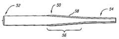FIG. 3 shows a side sectional view of a graft-catheter50 in accordance with a second embodiment of the present invention. The graft-catheter50, similar to the graft-catheter10, has agraft section52 and acatheter section54, but a taperedregion56 tapers in a much more gradual fashion than the taperedregion16 of the graft-catheter10. The more gradual transition from thegraft section52 to thecatheter section54 provides superior blood flow and improvements in the blood flow mechanics as the blood transitions through the graft-catheter50 from an artery to a vein. As discussed above, the graft-catheter50 may be comprised of ePTFE with apolyurethane coating58 over the catheter section54 (as shown) or, alternatively, thepolyurethane coating58 may completely coat the graft-catheter50. Furthermore, the graft-catheter50 may include an inner polyurethane coating (not shown) as discussed in further detail for certain of the following embodiments.