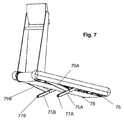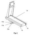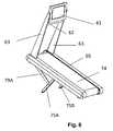FIG. 6 illustrates howtreadmill60 can be inclined to increase energy consumption by the user. A lifting linkage mechanism is provided, preferably including support bar mechanisms on both of the left and right sides of the bottom side oftreadmill60. Leftside support bar75A, which has a support bar wheel orroller77A towards its distal end, at a point of contact with the floor, is deployed downwards by operation of an electric motor mechanism described further below. As a result, the front of the treadmill is lifted, pivoting aboutrear wheels76 and78, mounted on the underside of the treadmill frame towards the rear oftreadmill60.Support bar75A is connected withlinkage bar79A as part of a lifting linkage mechanism which is explained in more detail in the following figures.