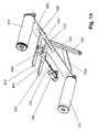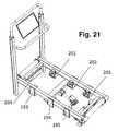 FIG. 21 is a perspective view from the top of the treadmill, with the belt and the deck removed for clarity. Left sidebellow support structures193,194 and195 are complemented by right sidebellow support structures201,202 and203. Each bellow support structure has a bellow mounted thereon. The deck (not shown for clarity) rests on these six bellows. Thedouble hinge structure204 operates analogously to hinge159 in the embodiment ofFIG. 14, helping reduce or eliminate side loads on the bellows.