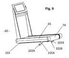 FIG. 8 illustratestreadmill60 in a high degree of incline, which can be achieved through the special incline mechanism geometry described herein. Embodiments of the treadmill ofFIG. 8 are believed to be able to achieve inclines of approximately 60%, which compares favorably with the maximum incline of 40% that certain prior art treadmills have been able to achieve. Another advantage of the special geometry oftreadmill60 is that when the treadmill is inclined,display61 andhandlebar62 rise with the walking/running surface ofbelt74, by virtue of being mounted onupright poles63, which in turn are connected with a common frame with the belt rollers. By raisingdisplay61 in conjunction withbelt74, a relatively consistent distance can be maintained between the user anddisplay61 at varying levels of incline. Such a configuration may be advantageous to users compared to prior art treadmills having a console and handlebar resting at fixed elevation relative to the floor, such that the distance from the user's upper body increases substantially when the treadmill is inclined, forcing the user to adopt an uncomfortable posture and hold on to special extended supports that protrude from the top of the console.