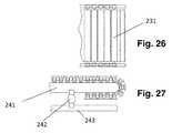 In other embodiments, a deckless treadmill design replaces a flexible belt with a series of adjacent slats extending across the treadmill perpendicularly to the direction of travel, to form a running surface. Deckless treadmill embodiments can still beneficially utilize variations of the suspension systems described herein. For example,FIG. 26 is a cutaway top view of the rear portion of a treadmill that does not have a deck. Self-supportingslats231 are sufficiently rigid to support the weight of a user, without a solid deck underneath. The cutaway side view inFIG. 27 shows that the slats run on aguide241.Slats231 and guide241 can all be carried and supported by a set ofbellows242, mounted onframe243.