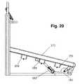 FIG. 20 shows a side elevation of the treadmill ofFIG. 18.Belt motor181 drivesbelt171.Incline motor192 operates to control the incline to runningsurface171. Left-sidebellow support structures193,194 and195, along with three matching bellow support structures on the right side of the treadmill (not shown), carry and support the deck. Bellowsupport structures193,194 and195 are constructed analogously to gussets152 inFIG. 16, providing a solid frame mounting point for air-filled bellows, with the deck fully suspended on the air-filled bellows.