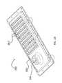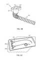 FIG. 2A is an exploded design schematic of adetachable feeder system300 for an articulating probe, such as articulatingprobe175 ofFIGS. 1A-1C, according to an embodiment of inventive concepts.FIG. 2B is an illustrative internal view of a feeder system according to an embodiment of inventive concepts. In an embodiment, thefeeder system300 includes ahousing360 having astabilization plate370, to whichcable bobbins380 are mounted.Housing360 is typically an injection molded, plastic housing, such as a reinforced plastic housing. In an embodiment, thestabilization plate370 is mounted tohousing360 proximate reinforcedhousing ribs362. In an embodiment,cables382 extend through aprobe arm315 comprising both inner and outer links (e.g., the links ofinner core12 andouter sleeve14 ofFIGS. 11A-11C). In an embodiment, thecables382 can be used to steer and/or releasably tighten to “lock”/stiffen either or both of the inner or outer links such as described above. In an embodiment, one ormore cables382 can be used to lock the links and two ormore cables382 can be used to steer the links. For example, threecables382 can be designated for steering the links ofouter sleeve14 ofFIGS. 11A-11C in three dimensions. These threecables382 can also be used for locking the outer sleeve. The remaining cable(s)382 can be used for locking the links ofinner core12. In an embodiment, when usingcables382 for locking, the forces applied can be distributed overcables382. For example, if a 36 lb force is applied for locking theouter sleeve14 connected to three cables, a force of 12 lbs can be applied to each of the connected cables. In an embodiment, three of thebobbins380 are configured to control the outer links, such as to steer, feed cable forprobe arm315 advancement, retract cable forprobe arm315 retraction,transition probe arm315 from a limp to a rigid state (e.g. to lock), and to transitionprobe arm315 from a rigid to a limp state (e.g. to become flexible). In this embodiment, onebobbin380 is typically used to control the inner links, such as to feed cable forprobe arm315 advancement, retract cable forprobe arm315 retraction,transition probe arm315 from a limp to a rigid state (e.g. to lock), and to transitionprobe arm315 from a rigid to a limp state (e.g. to become flexible). In some embodiments, the forces exerted by thebobbins380 can exceed 1, 10, 30 and/or 50 pounds, such as to lock the attached inner or outer links ofprobe arm315. In configurations in which four cables are used to steer and lockprobe arm315, collective forces exerted by the bobbins can exceed 95 pounds, such as when 50 pounds is applied to lock the inner links (e.g. with a single cable) and 15 pounds per cable is used to lock the outer links (e.g. with three cables). In various embodiments, the amount of force applied is related to the size (including diameter and length) of the links of theinner core12 andouter sleeve14 and also to the smoothness of the steering of the links. Greater force may be necessary to lock and stabilize a set of larger and/or longer links, including when the links are extended or retracted with respect to each other.