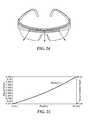 Because a variety of lightguide shapes may be used (including, e.g., an arched lightguide), the plurality of light extractors can be arranged or shaped to compensate for the spreading of light due to the shape of the lightguide. For example, at times the light extractors must compensate for an arched lightguide in the x-y plane as illustrated inFIG. 18. Here, thelightguide1800 may be arched such that the backreflective surface35 conforms to the surface of the wearable device which the user is wearing (where such a device has a convex front surface). As usual, light fromlight source15 enters the lightguide atfirst surface12, and is directed generally towards second surfaced14. A second light source (not shown) may also emit light into thesecond surface14 of the lightguide and direct light towardsfirst surface12.