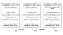 By way of general introduction, the IPv6 header (versus the previous IPv4 header) was simplified to a fixed size of 40 bytes, and then any number of subsequent extension headers may be added. The IPv4 header had more fields and was 20 to 60 bytes in size. Additional IP options were moved from the main IPv6 header into additional headers, referred to as extension headers (EH) that may be appended to the main header as needed. The permissible EHs are shown inFIG. 2. With reference toFIG. 3 andFIG. 4, the first 8bits403 of each EH401 identify the next header (another EH or upper layer protocol, such as TCP) following that header. The next 8bits405 specify the length of the option data field, in octets, not including the first 8 octets. Theoption data field407 is a variable-length field, of length such that the complete Destination Options header is an integer multiple of 8 octets long, and contains one or more type/tag, length, value (TLV) encoded options. Extension headers may include a hop-by-hop header, destination header, routing header, fragment header, authentication header, and encapsulating security payload (ESP) header. Only the hop-by-hop header must be examined by every node on a path and, if present, the hop-by-hop header must be the first header following the main IPv6 header. Every EH must only occur once. Only the destination options extension header (DOEH) may occur twice: once before a routing EH and again before the upper layer header (after the ESP header). Further information regarding extension headers is included in RFC 2460.