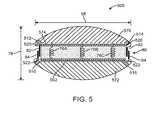 FIG. 5 shows ashock absorbing core500 with channels to allow fluid to move through the core, according to embodiments of the present invention. Many components ofcore500 are similar tocore16 shown above.Core500 comprises achannel510, achannel512, achannel514 and achannel516. Anupper component570 andlower component572 ofcore500 define achamber502.Resilient material574 andresilient member76A,resilient member76B andresilient member76C can be disposed between the upper and lower components withinchamber502.Resilient material574 may comprise anupper channel520 and alower channel522 to permit drainage fromresilient material574 and/or the chamber. In many, embodiments,core500 compriseschannel510,channel512,channel514 andchannel516 withoutresilient material574.Channel510,channel512,channel514 andchannel516 extend fromchamber502 to an external surface ofcore500 to permit fluid to drain from the core and/or pass through the core.